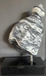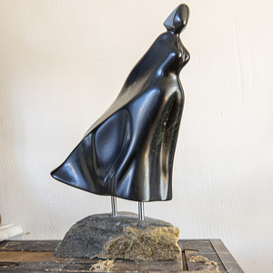 2021fier staand vrouw ondanks alle tegenwind. Gemaakt van serpentijn. Afmetingen inclusief sokkel van steen.